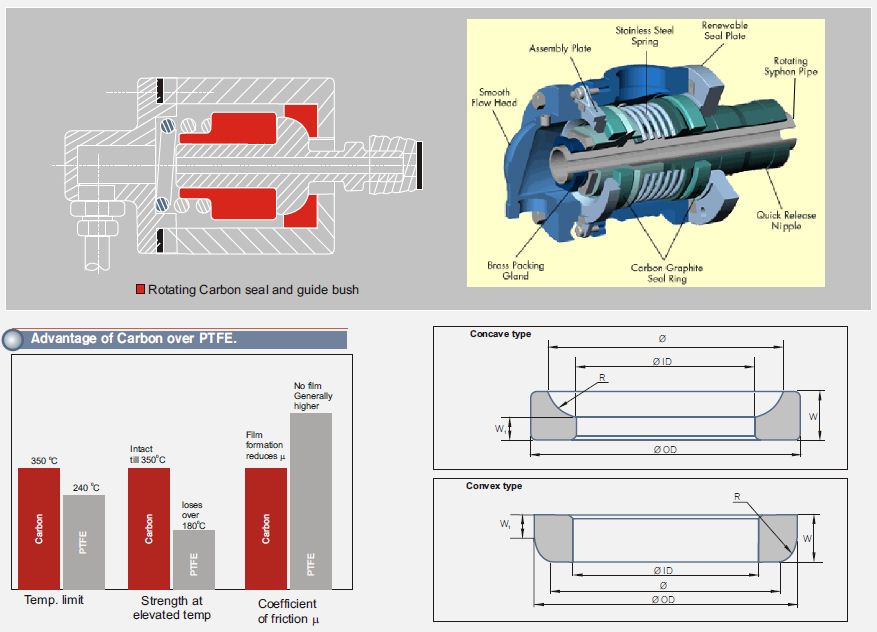 The most efficient way to connect the steam supply to the rotating unit is a by means of a steam nozzle using Carbon sealing rings, which have a high degree of reliability and maintainability. Carbon is self-lubricating and has excellent resistance to wear; it beds in rapidly and does not wear or score the counter faces. Carbon has high mechanical strength under compression and maintains its properties at high temperatures.